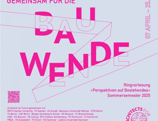 Unter dem Titel "Perspektiven auf Bestehendes“ veranstalten Architects for Future und das Hochschulnetzwerk „Gemeinsam für die Bauwende in der Lehre“ im Sommersemester 2025 eine Hybrid-Ringvorlesung. Immer mittwochs von 16 bis 18 Uhr finden im Mai und Juni 2025 spannende Vorträge statt.